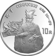 银币“孔子”的后置背景,同其它银币一样,上环为中文名(孔子)、英文名(confucius)和生卒年代(公元前551-479)。右半部大片留白,只有中端缀有“10元”面额。与之相对应,或略上一点,是一组演奏乐器的场面的。其中最显眼的,便是编钟。编钟是当时最高级别的打击乐器,用青铜铸成,它由大小不同的扁圆钟按照音调高低的次序排列起来,悬挂在一个巨大的钟架上。因每个钟的音调不同,用丁字形的木锤和长形的棒分别槌敲打,可以演奏出美妙的乐曲。“不图为乐之至于斯也。如天之无不帱也,如地之无不载也!”孔子非常重视音乐的社会功用和德育教化功能,主张用礼、乐来贯彻。孔子在强调乐教的社会功用的同时,又强调音乐的愉乐作用。 |