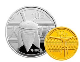 央行于2012年8月31日发行的“中国青铜器金银纪念币(第1组)”,以中国青铜器为题材,分别有金币2枚,银币3枚,背面图案分别为商代兽面纹方鼎、夏代乳钉纹爵、商代兽面纹斝、商代兽面纹鬲和商代弦纹盉,题材历史背景深刻,图案设计精美,铸造规格标准,是本年度最为热门的币种,上市销售价不断攀升。