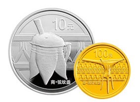 2012年8月31日,中国人民银行发行中国青铜器金银纪念币(第1组)一套,该套纪念币共5枚,其中金币2枚,银币3枚,均为中华人民共和国法定货币。其正面是常规图案,为中华人民共和国国徽,并刊国名、年号,背面图案则选取了先秦夏商时期具有典型性的青铜器样式,分别为商代兽面纹方鼎、夏代乳钉纹爵、商代兽面纹斝、商代兽面纹鬲、商代弦纹盉。