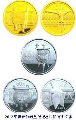 为见证中国青铜文化魅力,传承中国民族文化,中国人民银行于2012年8月31日发行了中国青铜器金银纪念币(第1组)一套,该套纪念币共5枚,其中金币2枚,银币3枚,以古代青铜器经典作品为背面图案,是在继1990年、1992年和1993年分别发行的三组中国出土文物(青铜器)金银纪念币之后,时隔十九年,重新启动的出土文物题材的金银纪念币。