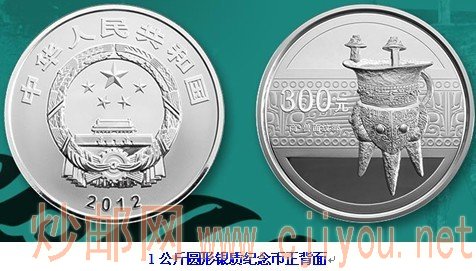 该套系列币正面图案均为中华人民共和国国徽,并刊国名“中华人民共和国”文字、且刊有年号“2012”字样。1公斤圆形银质纪念币背面图案“斝”,音为jia,与“假”同音,盛酒器和礼器。
