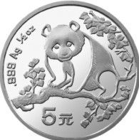 1/2盎司普制银币的正面图案,为双圈平视“天坛祈年殿”,“中华人民共和国”国号与“1993”年号,成弧状排列,分置于外圈的上沿和下沿。很庄重,很大气。背面图案左中偏上,与外环相行,是币面元素“.999 As 1/2oz”,面额5(大)元(小),设于下端。主图为“熊猫攀树图”,整个设计非常简洁,一株类似于枫的老树枝桠,由币面之左横生而出,到熊猫脚下时,又一分为二,至币右,枝叶上下长开,有趣的是,熊猫身前的老杆上,也有一小枝新叶,是从下端生出的,翻身转了个弯,又直立向上。这种顽强的生长态势,与熊猫努力适应环境的生存,有异曲同工之妙。 |
