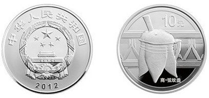 2012年8月31日中国人民银行发行一套(第1组)中国青铜器金银纪念币,其中1盎司银币就是商弦纹盉。此枚纪念币最大发行量为8万枚,正面图案与该套均为中华人民共和国国徽,并刊国民和年号。背面图案为商代弦纹盉,衬以该器物弦纹样等装饰组合设计,并刊“商•弦纹盉”字样及面额。轻巧精致,朴素大方,银色的光泽舒适宜人,表现出弦纹盉温文雅尔的性格,为钱币收藏者所喜爱。