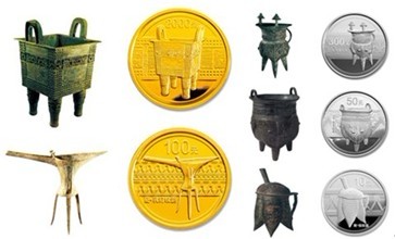 央行于2012年8月31日隆重发行了中国青铜器金银纪念币(第一组)一套,包括金币两枚,银币三枚,再一次以贵金属品质展示了中国古代青铜器的风韵。此次发行的这组金银币则是以青铜器中的礼器为主,是夏、商时期的精品之作。