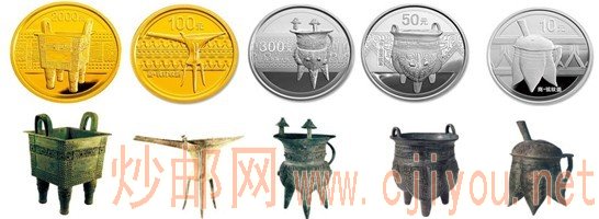 中国人民银行于2012年8月31日发行中国青铜器金银纪念币(第1组)一套。该组5枚金银币均以夏商时期开始流传的青铜器皿为蓝本,复刻“商•兽面纹方鼎、夏•乳钉纹爵、商•兽面纹斝、商•兽面纹鬲、商•弦纹盉”等字样于金银纪念币的背面,其中尤以鼎、斝、鬲等饕餮纹图案最能凸显青铜器具散发的凝重与神秘感。以动物面目形象出现的饕餮纹结构鲜明,兽型凶猛强悍,使先民对于力量的向往透过币面跃然浮于眼前。