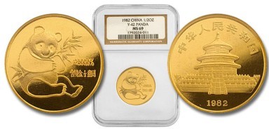 1982年版“熊猫”金币的正面图案,为北京天坛祈年殿。之前的1979年和1980年发行的金银纪念币都以“国徽”为主图,只是在编排上略有变化。1981年传统的设计理念有了颠覆,出现了两款“国徽”之外的图案。1982年,中国现代贵金属纪念币共发行3套金银币,但其中两套,又都以“天坛祈年殿”为正图。而其中之一,就是“熊猫”。 |