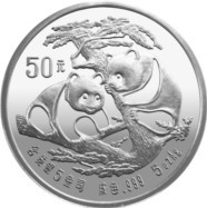 1988年,大规格“熊猫”银币终于在中国现代贵金属纪念币上露脸。这年问世的两款品种,分别是12盎司和5盎司“熊猫”精制银币。前者编号“1988-0113”,币面直径80毫米,面额100元,成色99.9,发行量5000元;后者编号“1988-0114”,币面直径70毫米,面额50元,成色99.9,发行量11000元。 |