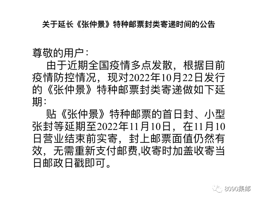 《张仲景》邮票首日封时效也“续杯” 日期:2022-11-03 来源:中国邮政 在“20TH”首日封的时效,因为疫情等问题被“续杯”之后。在大会邮票之后发行的《张仲景》邮票的首日封时效,也被“续杯”。 因为疫情等问题,在“20TH”邮票首日封的时效被“续杯”之后,在其之后发行的《张仲景》邮票的首日封的时效,也遭遇“续杯”待遇: