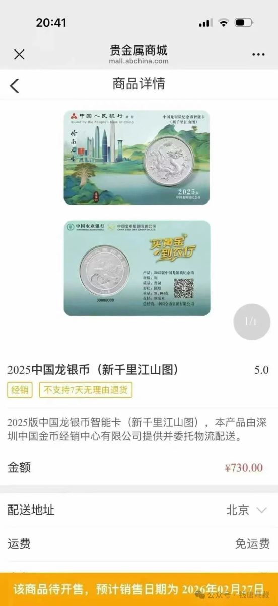 上一次,3000套,我一点进去就没有,系统卡死,,,,这一次,,,唉,,参与吧,大家,,, 2月27日早上10点农行app搜"千里江山",购买2025中国龙银币(新千里江山图), 市场回收行情,,,,1500左右闷包,,如果还是730发行,,,那么抢到赚大了,,,,,每人5个,,,,哈哈😃.jpg)