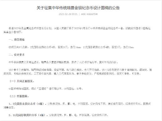 中华传统瑞兽金银纪念币是2023年新开启的项目。根据设计图稿征集公告得知,金银币图案分别表现龙、凤、麟、龟。