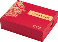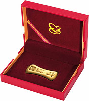 “龙年金铤”包装盒图二 此次发行的中国金币龙年金铤分为“龙”字金铤、“平安”金铤、“吉祥”金铤、“如意”金铤共4个品种,其中“龙”字金铤有1000克、500克、200克、100克、50克五个规格,“平安”金铤、“吉祥”金铤、“如意”金铤均有500克、200克、100克、50克四个规格。“龙”字金铤正面图案上部为中国金币品牌标识,中部为篆书“龙”字和龙形图案,下部为成色Au.9999和重量等文字;“平安”金铤、“吉祥”金铤、“如意”金铤的正面图案上部均为中国金币品牌标识,中部分别为“平安”、“吉祥”、“如意”字样,下部为成色Au.9999和重量等文字;龙年金铤背面图案均为“中国金币壬辰年制”字样及产品编号。