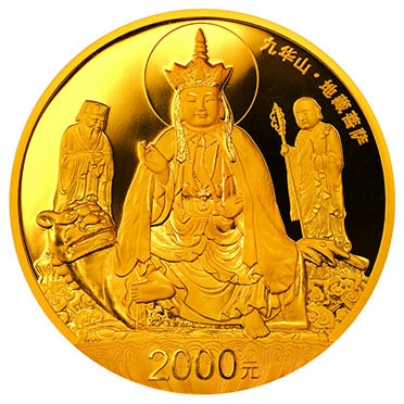 155.52克(5盎司)圆形金质纪念币背面图案为“地藏菩萨、道明、闵公”组合造像,并刊“九华山·地藏菩萨”字样及面额。