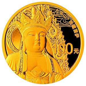 7.776克( 1/4盎司)圆形金质纪念币背面图案为“地藏菩萨”造像,衬以祥云纹饰组合设计,并刊“九华山·地藏菩萨”字样及面额。