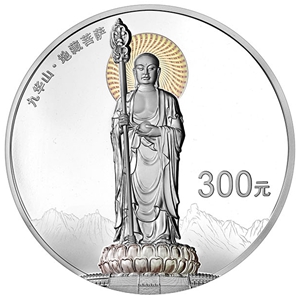 1公斤圆形银质纪念币背面图案为“地藏菩萨”立像,衬以笔架峰造型组合设计,并刊“九华山·地藏菩萨”字样及面额。