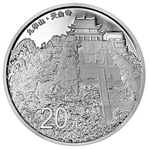 62.208克(2盎司)圆形银质纪念币背面图案为“天台寺”景观造型,并刊“九华山·天台寺”字样及面额。
