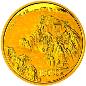 1公斤圆形金质纪念币背面图案为“百岁宫”景观造型,并刊“九华山·百岁宫”字样及面额。