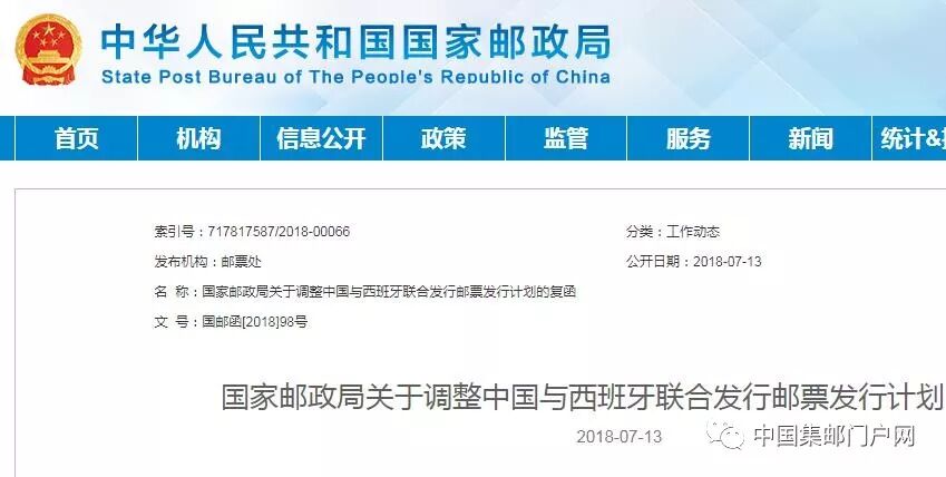 你公司关于建议调整中国与西班牙联合发行邮票发行时间的函(中国邮政函〔2018〕65号)收悉。我局高度重视你公司反映的有关问题,经研究,同意取消2018年纪特邮票发行计划中原定中国与西班牙联合发行邮票的发行计划。今后,视你公司与西班牙邮政的切实合作情况再统筹确定此套选题的发行时间(集邮门户网讯)。