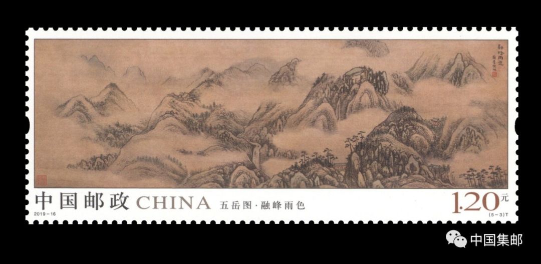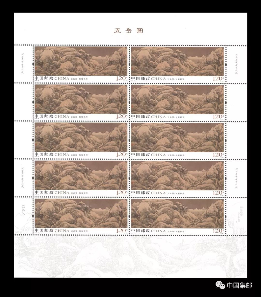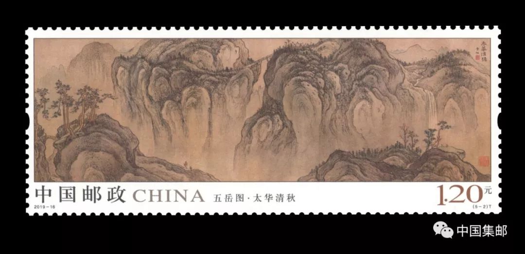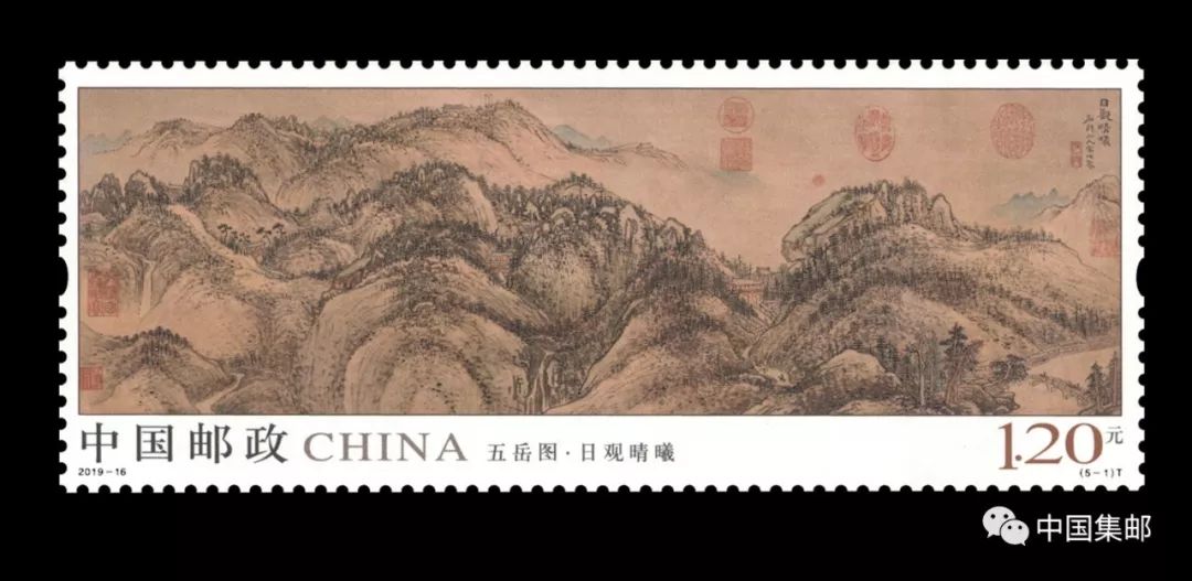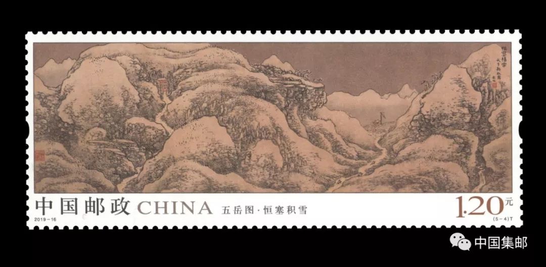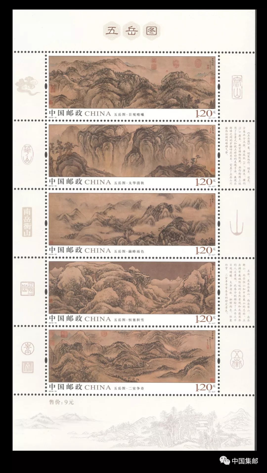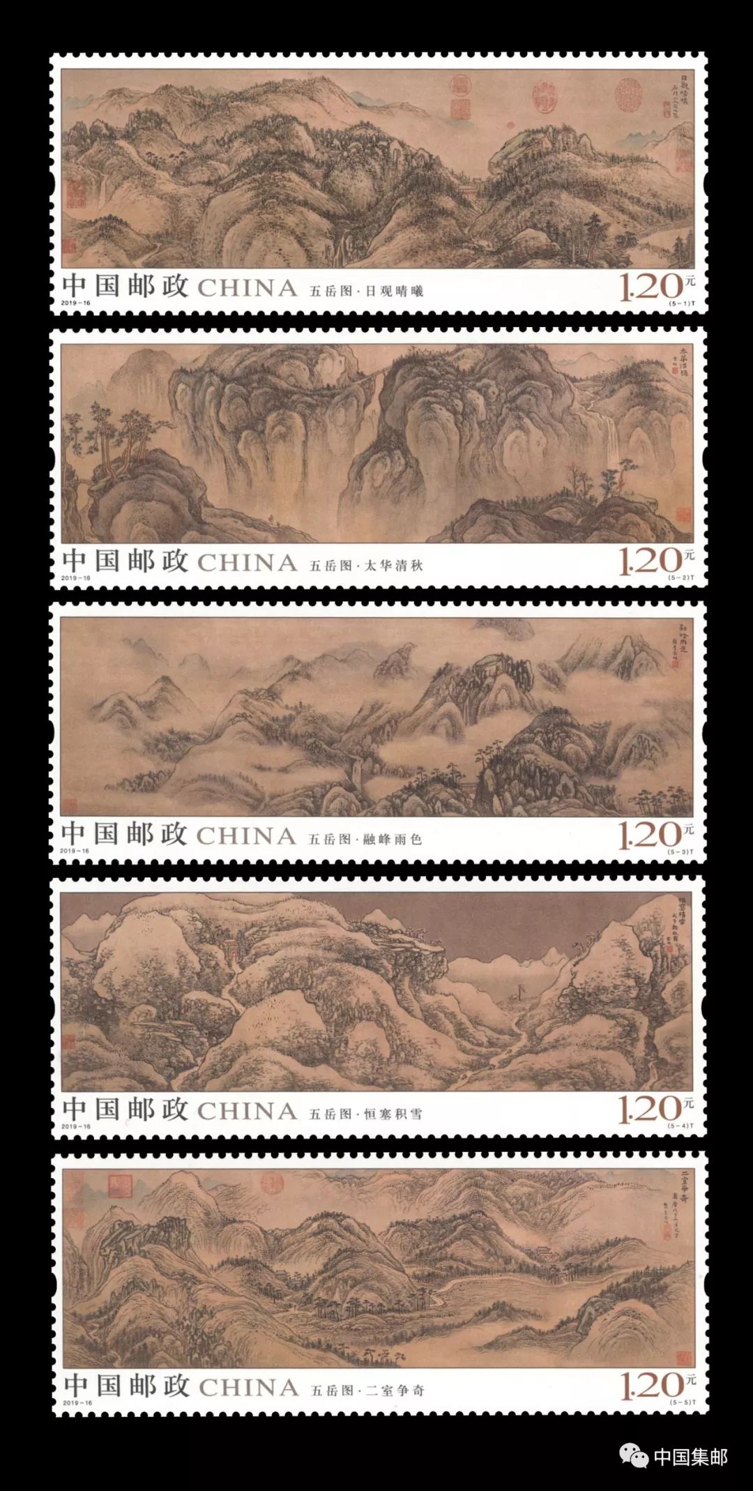 中国邮政定于2019年8月3日发行《五岳图》特种邮票1套5枚,小全张1枚。详情如下:
