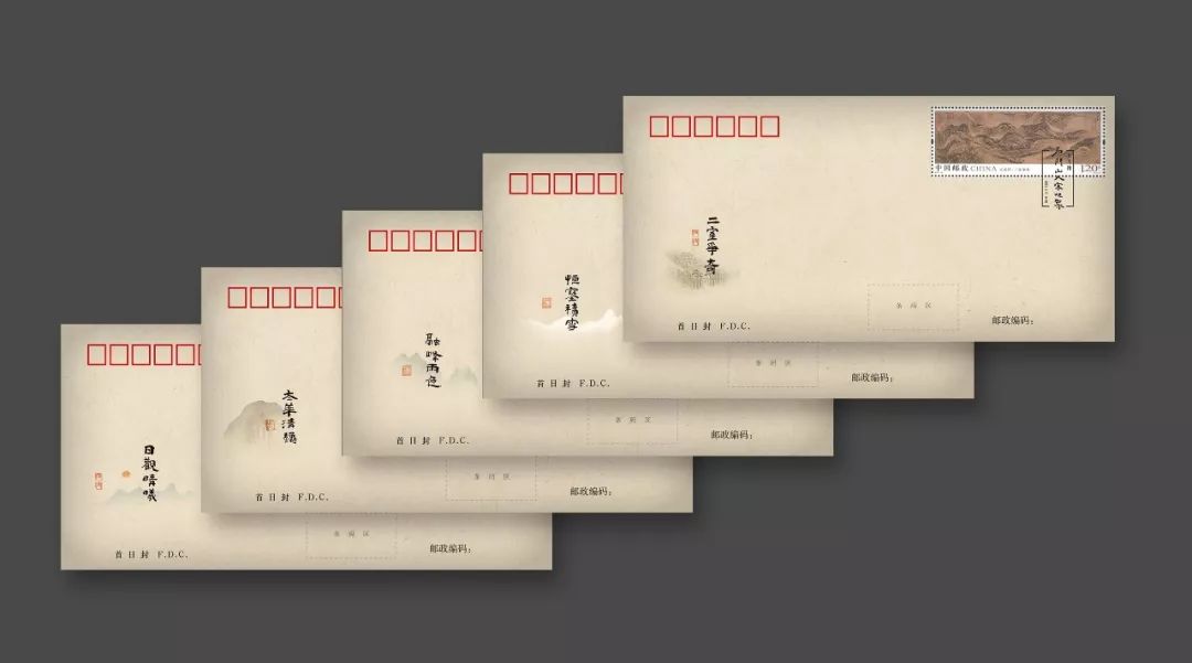 首日封1套5枚。因循《五岳图》各图主旨,首日封设计拟只选一角为背景,衬托宋旭手书画名及印章,着意凸显邮票,表达对古画本身及其作者的敬意。
