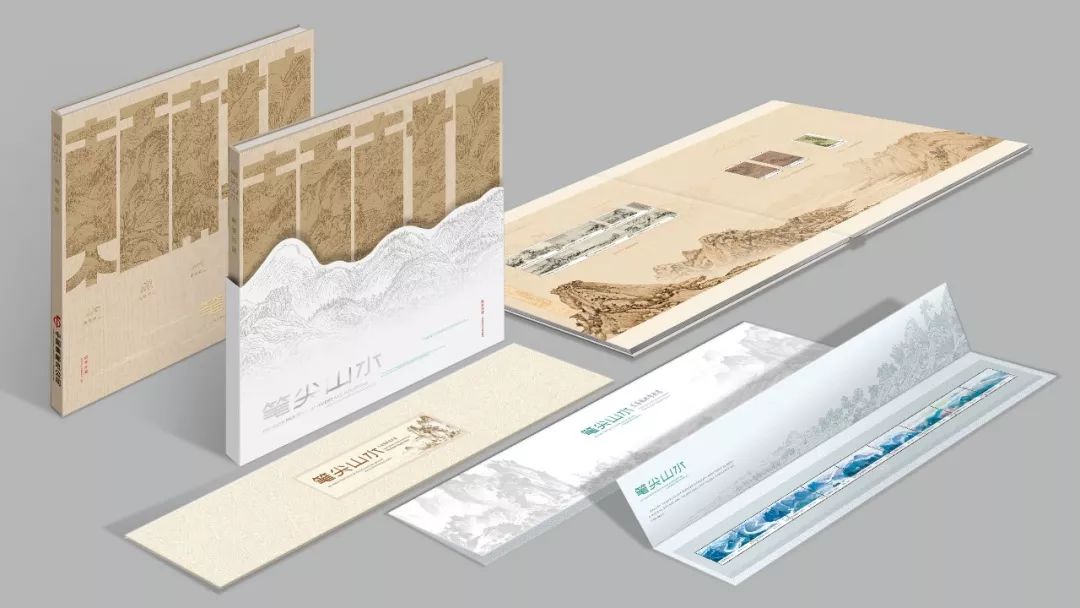 3、设计创新地表现中国文化艺术。插套选取宋旭《五岳图》局部,做异形模切,标题文字起鼓烫亚银。封面设计以“东西南北中”文字图形为主题,文字内部选取对应对东岳泰山、西岳华山、南岳衡山、北北岳恒山、中岳嵩山画面,下方对应各山的ICON,标题文字起鼓烫金。内页边饰设计以卷轴为概念,选取邮票内容所对应的古画局部。