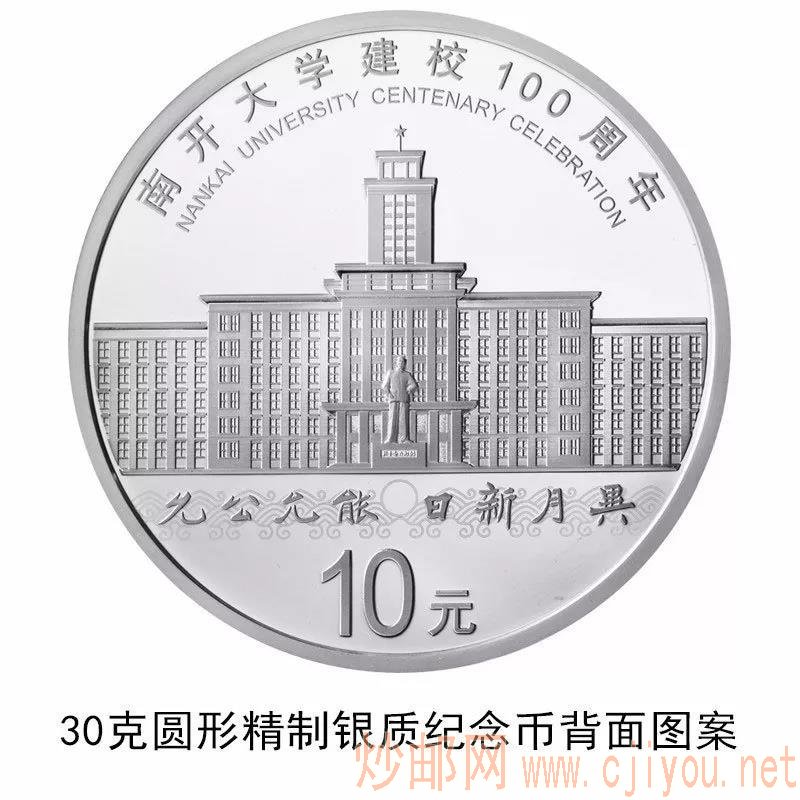 30克圆形银质纪念币背面图案为南开大学主楼、校训及校钟装饰纹样等组合设计,并刊“南开大学建校100周年”中文字样、“NANKAI UNIVERSITY CENTENARY CELEBRATION”英文字样及面额。