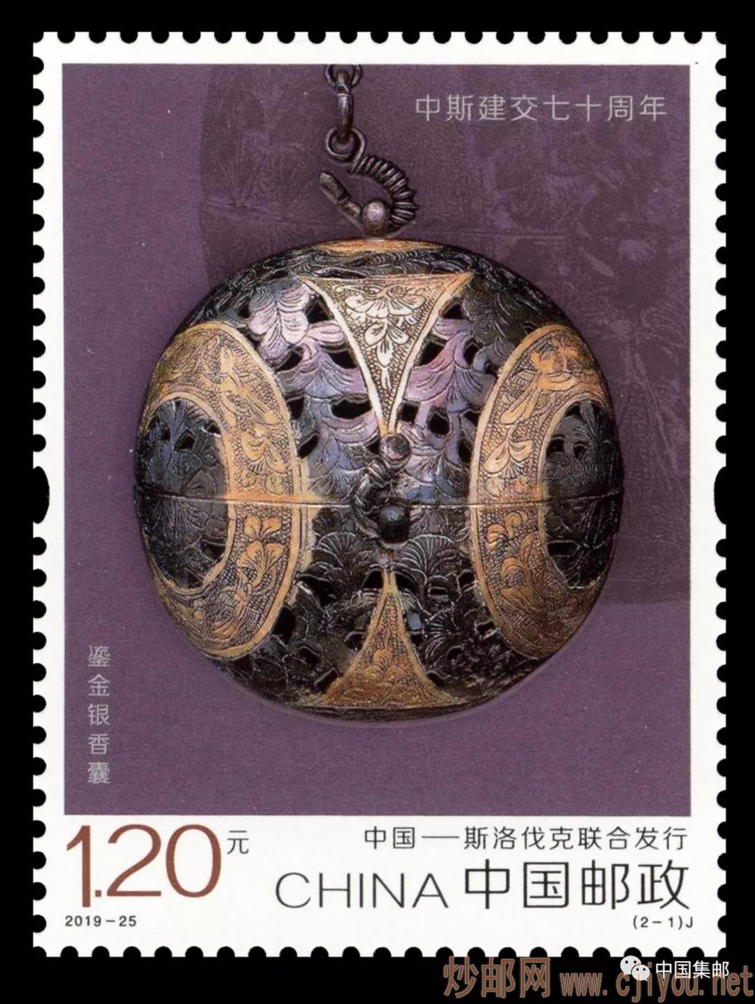 中国邮政定于2019年10月6日发行《中斯建交七十周年》纪念邮票1套2枚(与斯洛伐克联合发行),邮票图案名称分别为:鎏金银香囊、鎏金铜圆牌。全套邮票面值为2.40元。