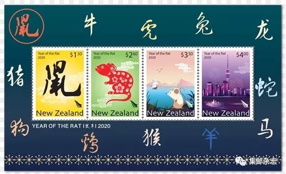 新西兰今日发行“鼠年”生肖邮票 日期:2019-12-04 新西兰邮政于2019年12月4日发行“2020鼠年生肖”邮票一套4枚,同时发行小全张一枚。邮票图案为汉字“鼠”等。 新西兰邮政还于12月4日发行“新年快乐 万事如意”邮票小全张一枚,小全张为圆形,内含12枚圆形邮票。图案为十二生肖。