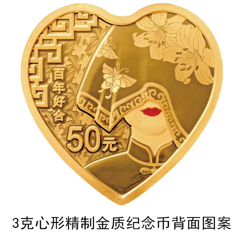 3克心形金质纪念币背面图案为新娘、百合、窗棂等组合图案,并刊“百年好合”字样及面额。