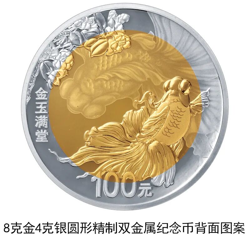 8克金4克银圆形双金属纪念币背面图案为金鱼与海棠花等组合图案,并刊“金玉满堂”字样及面额。