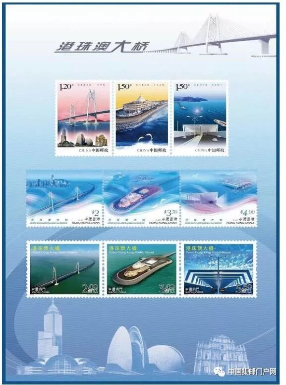 集邮门户网讯 《港珠澳大桥》邮票中国邮政、香港、澳门将在10月近日同步发行邮票,同时发行三地短腿小版张(小全张)中国邮政和香港澳门邮政联合发行中港澳三地短腿小全张。集邮门户网了解到,中方邮票全套3枚,面值为1.2元、1.5元、1.5元。三地邮票保持风格一致,凸出一国两制下的大桥三地特点,邮票图案和三地短腿小版图案已公布(见本站店铺)。集邮门户网继续最后征订1天此套邮票的珠海原地首日实寄封、盖珠海日戳极限片。和谐加贴JP同图珠港澳邮资片还有最后两套,总公司封、北京公司官封售罄。详情请到微店查看。